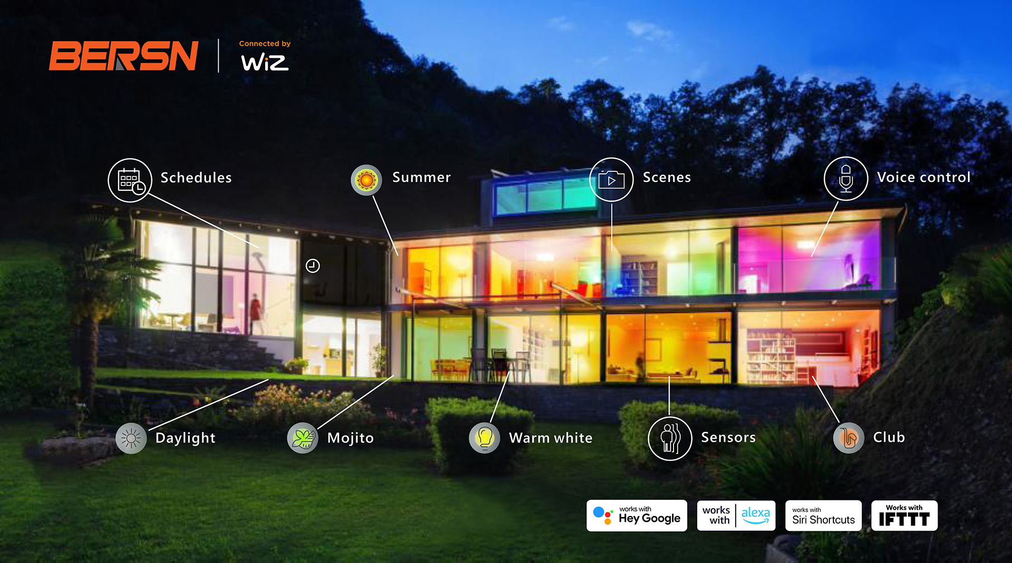 使用 BERSN 智能 LED 遙控器一鍵控制燈光。該遙控器適用 于所有 WiZ 產(chǎn)品。即使沒有 Wi-Fi 也可開燈或關(guān)燈、調(diào)亮 或調(diào)暗房間內(nèi)的燈光、設(shè)置夜燈,或設(shè)置多達(dá)四種常用燈光 模式。聯(lián)系我們